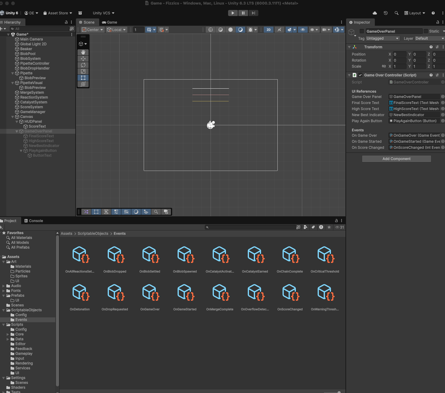 Fizzics is different because its physics-heavy gameplay creates a web of reactions that need to happen simultaneously. When a blob detonates, scoring updates, VFX spawns, haptic feedback fires, the chain counter increments, and nearby blobs get displaced. If every system called every other system directly, I'd have spaghetti by Sprint 2. I've written that spaghetti before. I've been the spaghetti. Not again.