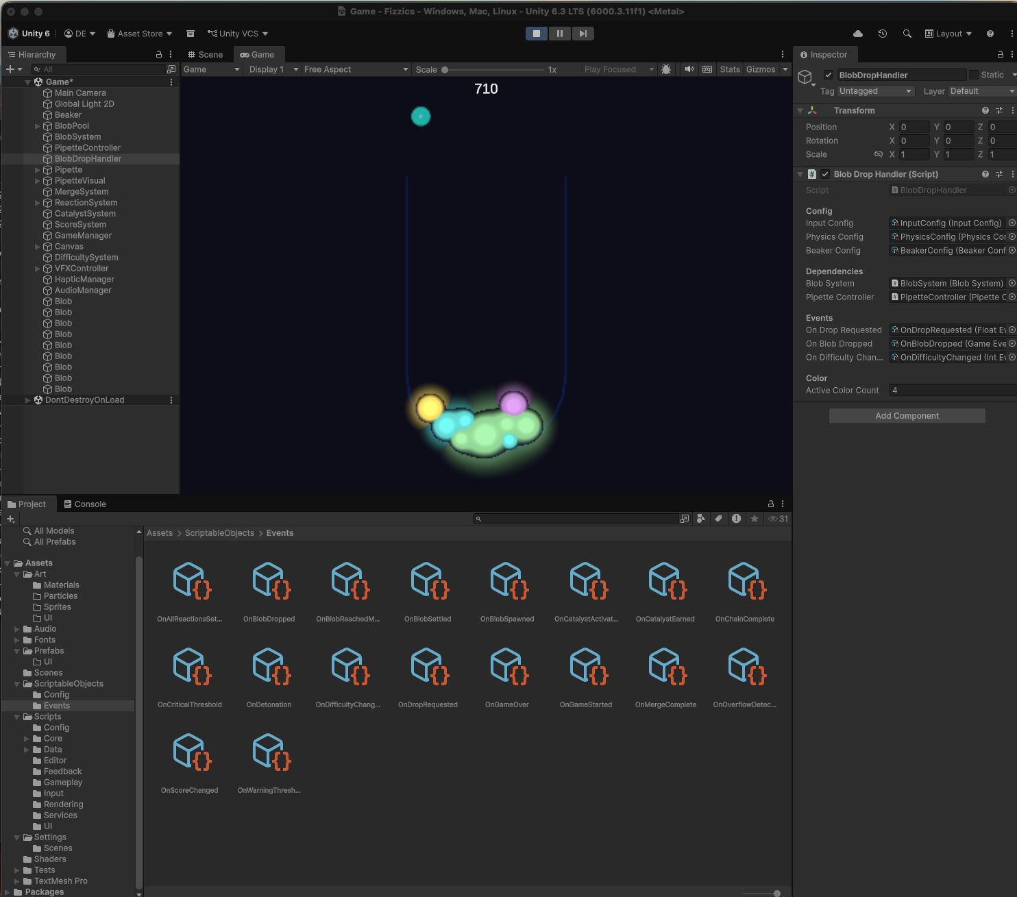 Pre-Production gave me a complete blueprint. Production is where it becomes a game. Three sprints in, Fizzics went from an empty Unity scene to a playable prototype with merge mechanics, chain reactions, explosion VFX, haptic feedback, and a scoring system, all backed by 205 passing tests.