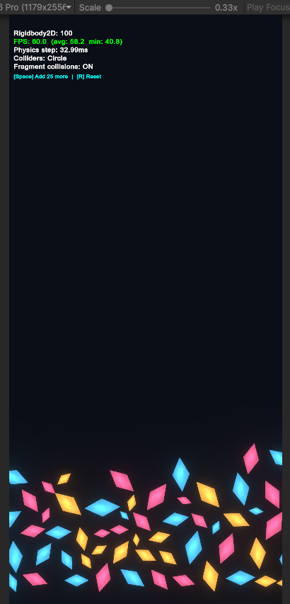 The practical takeaway: PolygonCollider2D with 6 vertices is fine for fragments. No need for circle approximations, no need for collision layer tricks, no need to disable fragment-to-fragment collisions. The physics budget is not a constraint on game design.