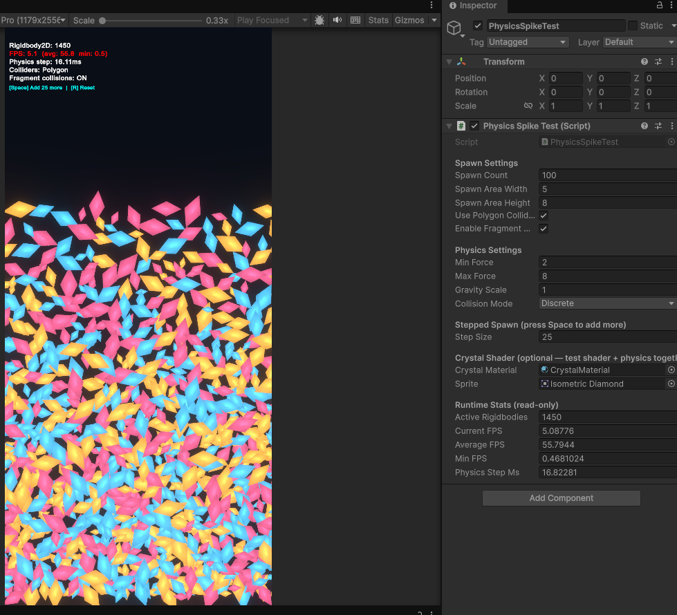 This is the one that could have gated everything. Crystal fragments are Rigidbody2D with PolygonCollider2D. Orbs are Rigidbody2D with CircleCollider2D. At peak chaos (multiple simultaneous shatters, orbs bouncing, fragments flying), the scene could have 60-80 physics bodies active. If the physics engine choked at that count, the game concept doesn't work.