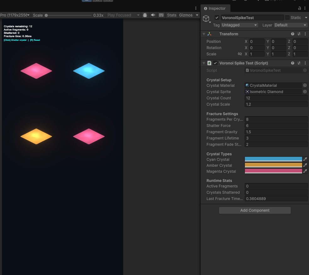 The question: can I shatter 2D crystals into Voronoi fragments that look satisfying, run at 60fps, and don't blow the physics budget?